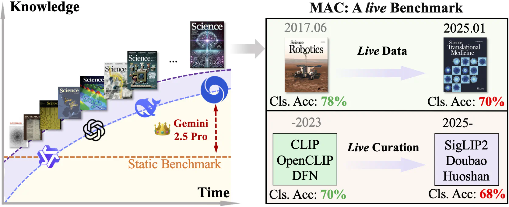 As multimodal large language models (MLLMs) grow increasingly capable, fixed benchmarks are gradually losing their effectiveness in evaluating high-level scientific understanding. In this paper, we introduce the Multimodal Academic Cover benchmark (MAC), a live benchmark that could continuously evolve with scientific advancement and model progress. MAC leverages over 25,000 image-text pairs sourced from issues of top-tier scientific journals such as Nature, Science, and Cell, challenging MLLMs to reason across abstract visual and textual scientific content. Experiments on our most recent yearly snapshot, MAC-2025, reveal that while MLLMs demonstrate strong perceptual abilities, their cross-modal scientific reasoning remains limited. To bridge this gap, we propose DAD, a lightweight inference-time approach that enhances MLLMs by extending MLLM visual features with language space reasoning, achieving performance improvements of up to 11%. Finally, we highlight the live nature of MAC through experiments on updating journal covers and models for curation, illustrating its potential to remain aligned with the frontier of human knowledge. We release our benchmark at